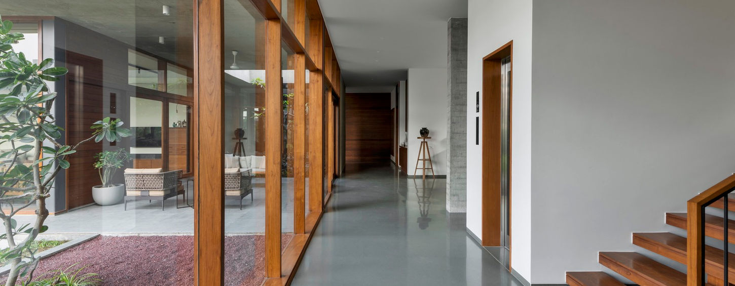 This residence is a thoughtfully designed home for three generations, blending openness and functionality in its spatial arrangement. The design focuses on creating a seamless connection between indoor and outdoor spaces while accommodating the diverse needs of a multi-generational family. The house is arranged in an L-shaped layout with a compact footprint, allowing for a substantial portion of the 9000 sq ft plot to remain as open green space. A central courtyard and semi-open verandah enhance the spatial flow, filling the interiors with natural light and providing vibrant communal areas. The hovering upper levels maximize usable space while maintaining a minimal ground-level impact, creating a dynamic architectural form.