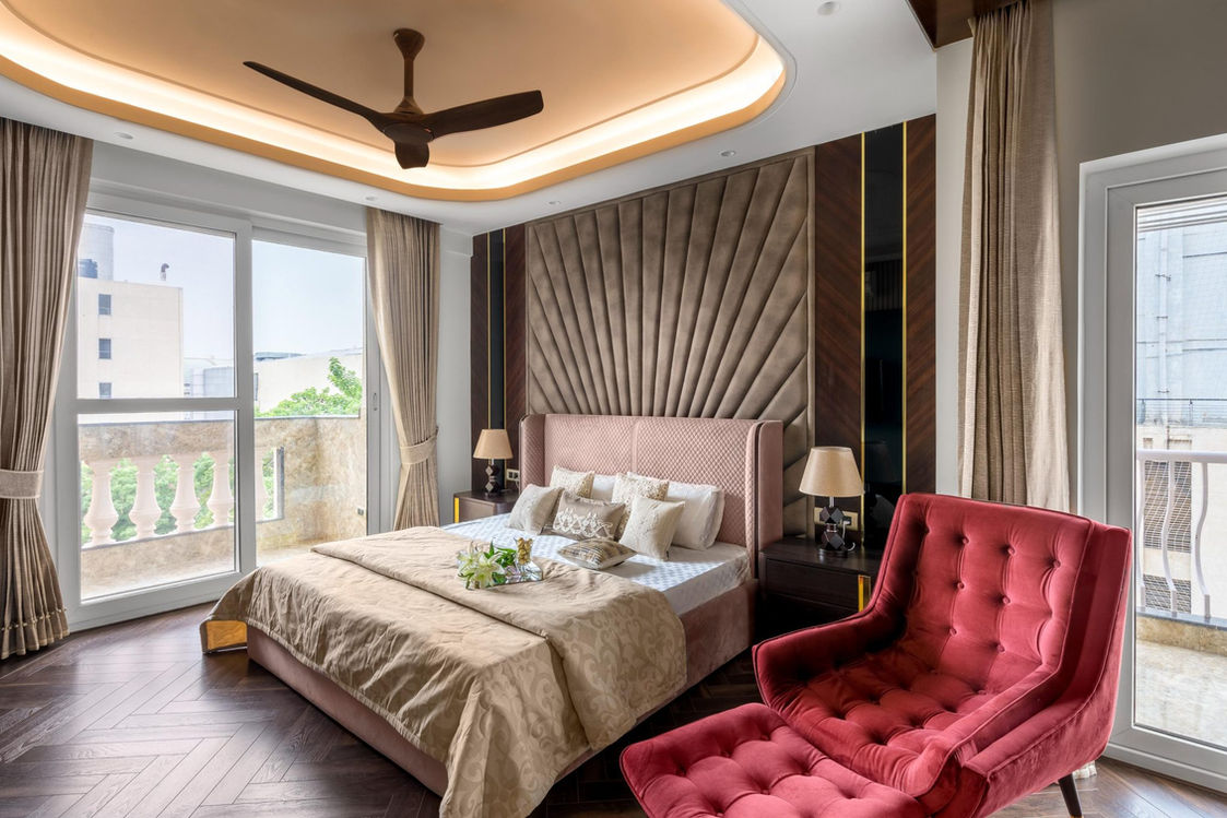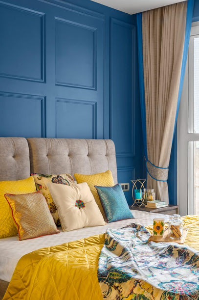 Private quarters maintain the home’s expressive character, with each bedroom reflecting the personality of its occupant. The guest room embraces a serene beige backdrop with bold red accents, while the son’s bedroom contrasts deep blue walls with ochre and grey furnishings, highlighted by a blue Onyx accent wall and a hand-painted basin. The master suite, a sanctuary of comfort, features warm herringbone flooring, regal beige and brown tones, and a maroon lounge chair, reinforcing its luxurious appeal. Hidden storage solutions within the TV wall ensure a clutter-free environment, while the master bath, clad in beige marble and crowned with an artistic mirror, completes this harmonious blend of grandeur and functionality.